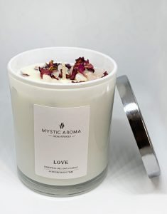 LOVE ESSENTIAL OIL WITH ROSE QUARTZ CRYSTALS AND DRIED HERBS CANDLE